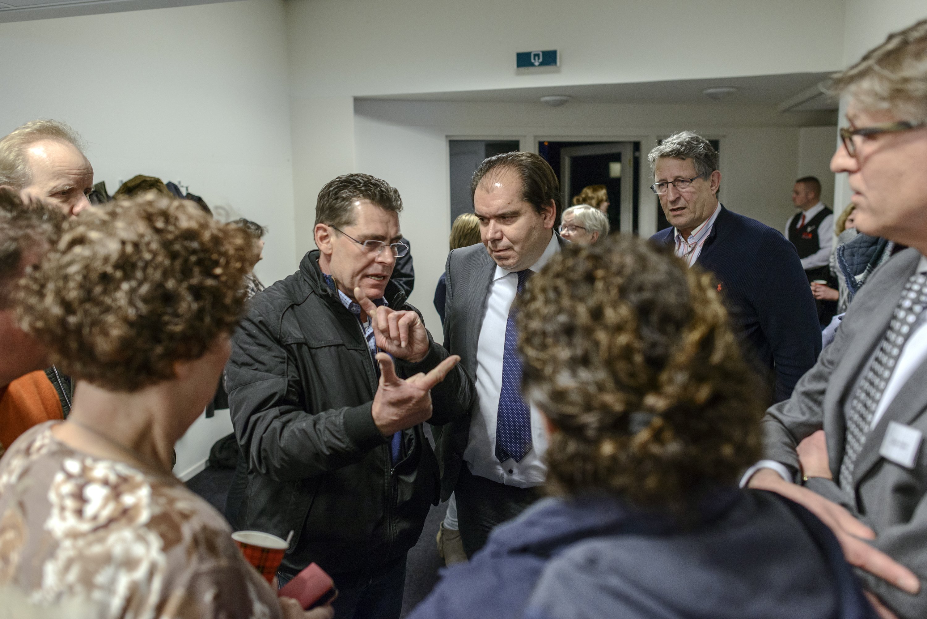 Enkele bezoekers in gesprek met burgemeester Marcel Thijsen. Soms even discussie over het informatie/traject, maar positief over het project ´Tussenvoorziening´. Een aantal direct omwonenden heeft aangegeven moeite te hebben met de informatieverstrekking aan de omwonenden; met hen zal binnenkort een constructief 'huiskamergesprek' volgen.