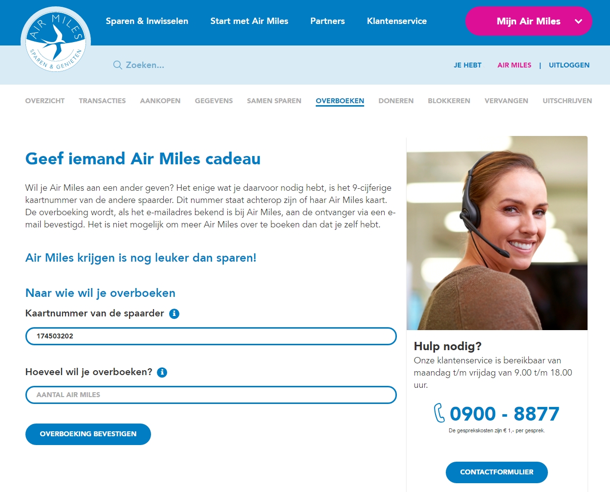 Het doneren van Air Miles is heel eenvoudig, via de website van Air Miles kunt u inloggen op uw persoonlijke pagina, hiervandaan kunt u bovenin de taakbalk 'overboeken' zien staan, hier kunt u het kaartnummer van Stichting INLIA invullen (174503202) en het aantal Air Miles dat u wilt doneren.